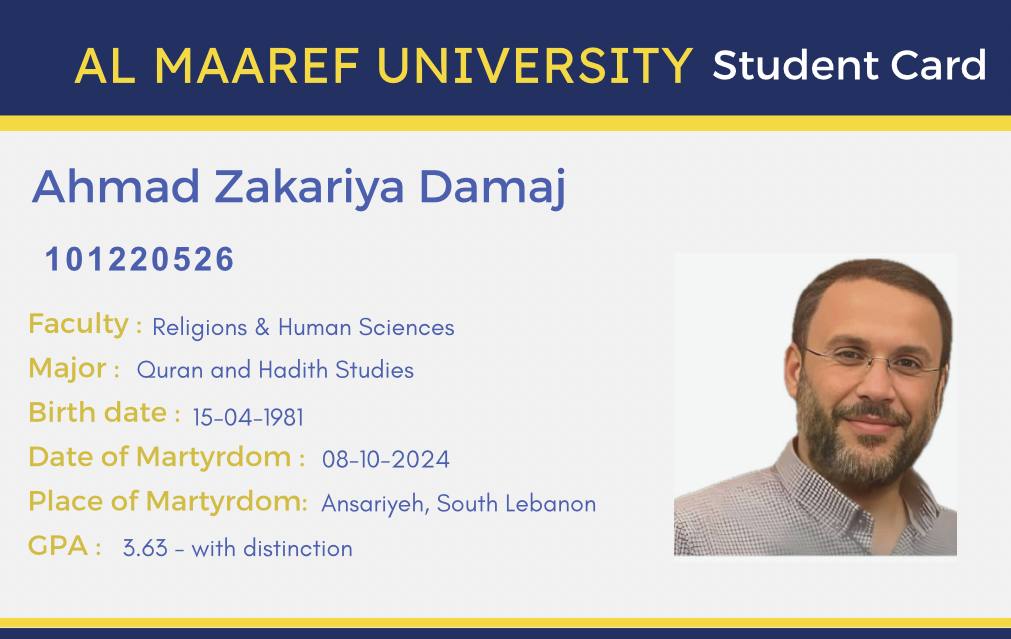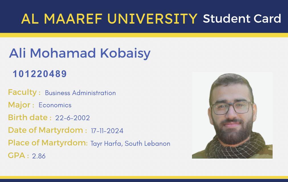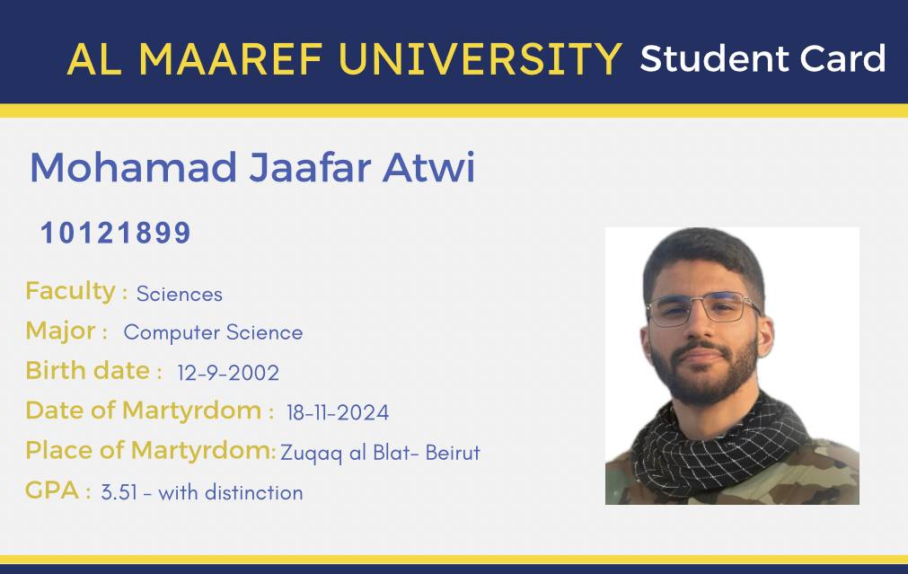 Martyr Mohammad Atwi was one of the distinguished students in the Computer Department. His presence and respectful attitude stood out from the beginning. He took Data Structures and Databases with Dr. Mubarak and was known for his love of challenge and excellence. He consistently sought high grades and even followed up on small bonus marks with enthusiasm.
